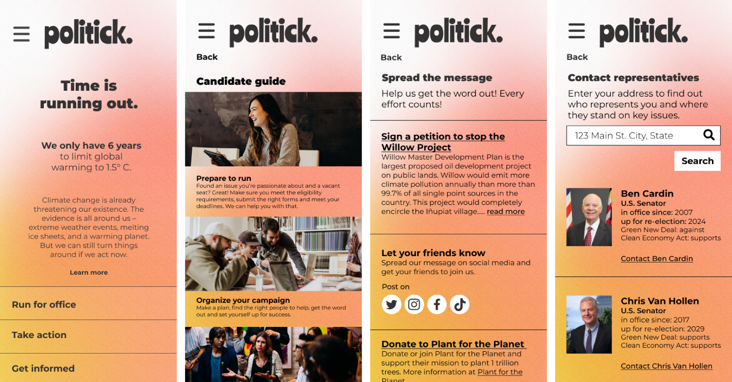 The problem: Young people are at the forefront of political action against climate change but the process of running for office or creating political change is tedious, confusing and outdated.The goal: Connect young people with resources to create political change and take action against climate change.